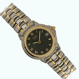 DESCRIPTION: Two tone case and bracelet, black dial, sweep second hand, gold roman numeral markers, quartz movement, alternating brushed and polished finish. Watch measures 29mm in diameter.