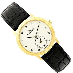 DESCRIPTION: 18k yellow gold case, Swiss mechanical movement, maual winding, white dial with gold Roman numerals, subdial seconds hand, black strap with 18k tang-type buckle. Watch measures 33.5mm in diameter by 6.5mm in depth.