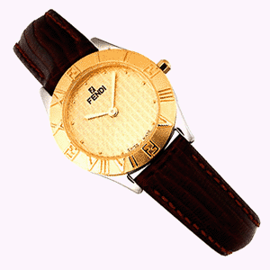 DESCRIPTION: Ultra thin stainless steel case with 10 micron 18k gold plated bezel with raised FF logo and roman numerals, genuine brown leather strap, champagne dial, gold hands and dot markers, water resistant to 100 feet, sapphire crystal, Swiss quartz.