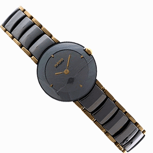 DESCRIPTION: Stainless steel case (diameter: 22mm), plantinum coloured bracelet of high-tech scratch-proof ceramic, grey coloured mirror dial, gold hands and quarter hour markers, sapphire crystal, water resistant up to 30 meters, Swiss made, quartz movement.