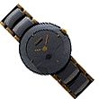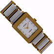 Rectangular stainless steel case, white coloured bracelet of high-tech scratch-proof ceramic with yellow plated accents, mother of pearl dial, gold dot hour markers, and hands, sapphire crystal, water resistant up to 30 meters, quartz movement, Swiss made.