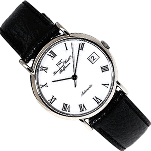 DESCRIPTION: Stainless steel case (34mm), carabou black leather strap, white dial with Roman numerals, date calendar at 3:00, sweep second hand, 21 jewel automatic movement, 42 hour power reserve, sapphire crystal, water resistant to 30m. Swiss made.
