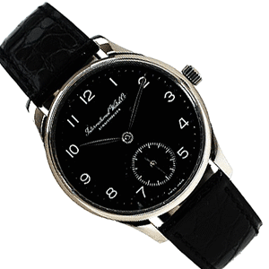 DESCRIPTION: Stainless steel case (35mm), crocodile glossy black leather strap, black dial with white arabic numerals, seconds subdial at 6:00, 36 jewel automatic movement, 38 hour power reserve, sapphire crystal, water resistant to 30 meters. Swiss made.