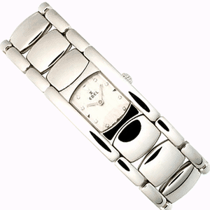 DESCRIPTION: High polished stainless steel case and link bracelet, silver textured dial with 8 diamond markers, Swiss quartz movement. Watch measures 28.3 by 21mm by 6.4mm in depth. Domed sapphire crystal. Water resistant to 30m.