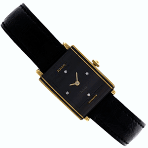 DESCRIPTION: Rectangular stainless steel case with gold tone accents, black leather strap, black dial, diamond markers at the quarter hours, sapphire crystal, water resistant up to 30 meters, Swiss quartz.