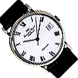 Stainless steel case (34mm), carabou black leather strap, white dial with Roman numerals, date calendar at 3:00, sweep second hand, 21 jewel automatic movement, 42 hour power reserve, sapphire crystal, water resistant to 30m. Swiss made.