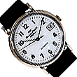Stainless steel case (34mm), caribou black leather strap, white dial with Arabic numerals, date calendar at 3:00, sweep second hand, 21 jewel automatic movement, 42 hour power reserve, sapphire crystal, water resistant to 30 meters. Swiss made. Also availible with brown strap. Please specify band color preferred when ordering.